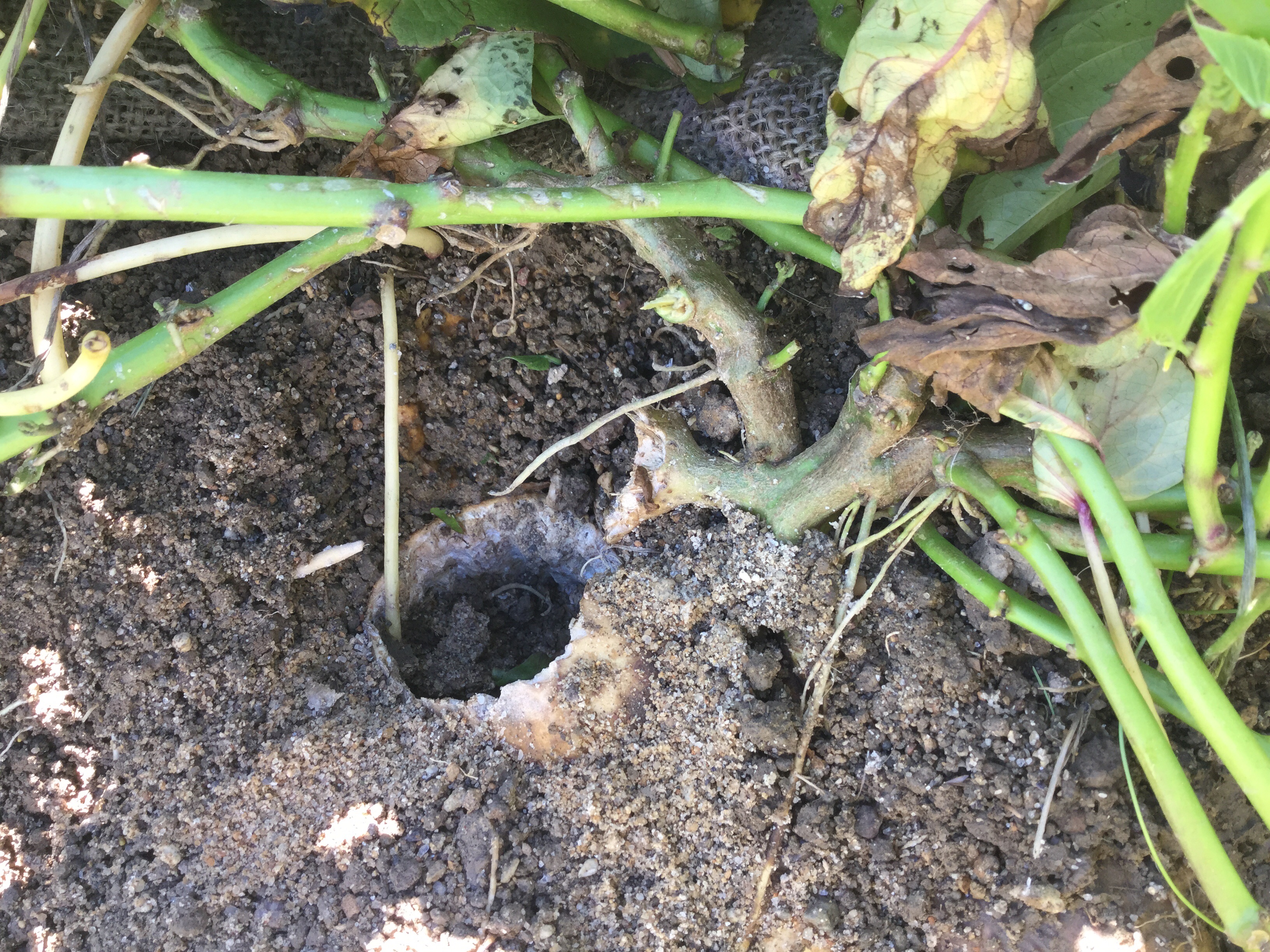 Once they are established I surround the plants right up to the stem with folded burlap coffee sacks. (Free from coffee roasters) This acts as a mulch and provides some protection from the pheasants who will go to great lengths to get the kumaras later in the season, even smashing the stems to dig in the space free of sacking at the base. While the soil is dry they don’t seem to be able to dig too deeply.