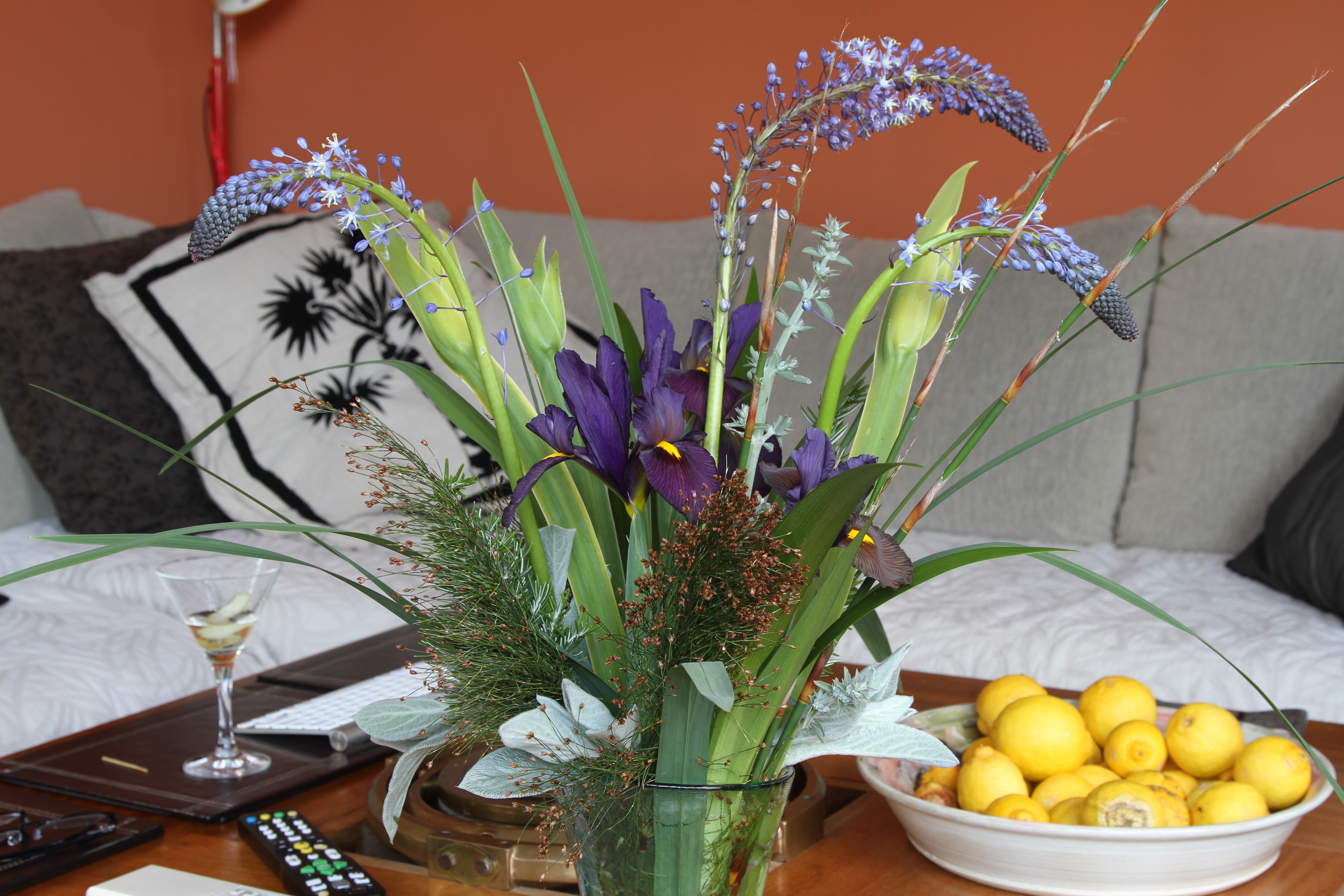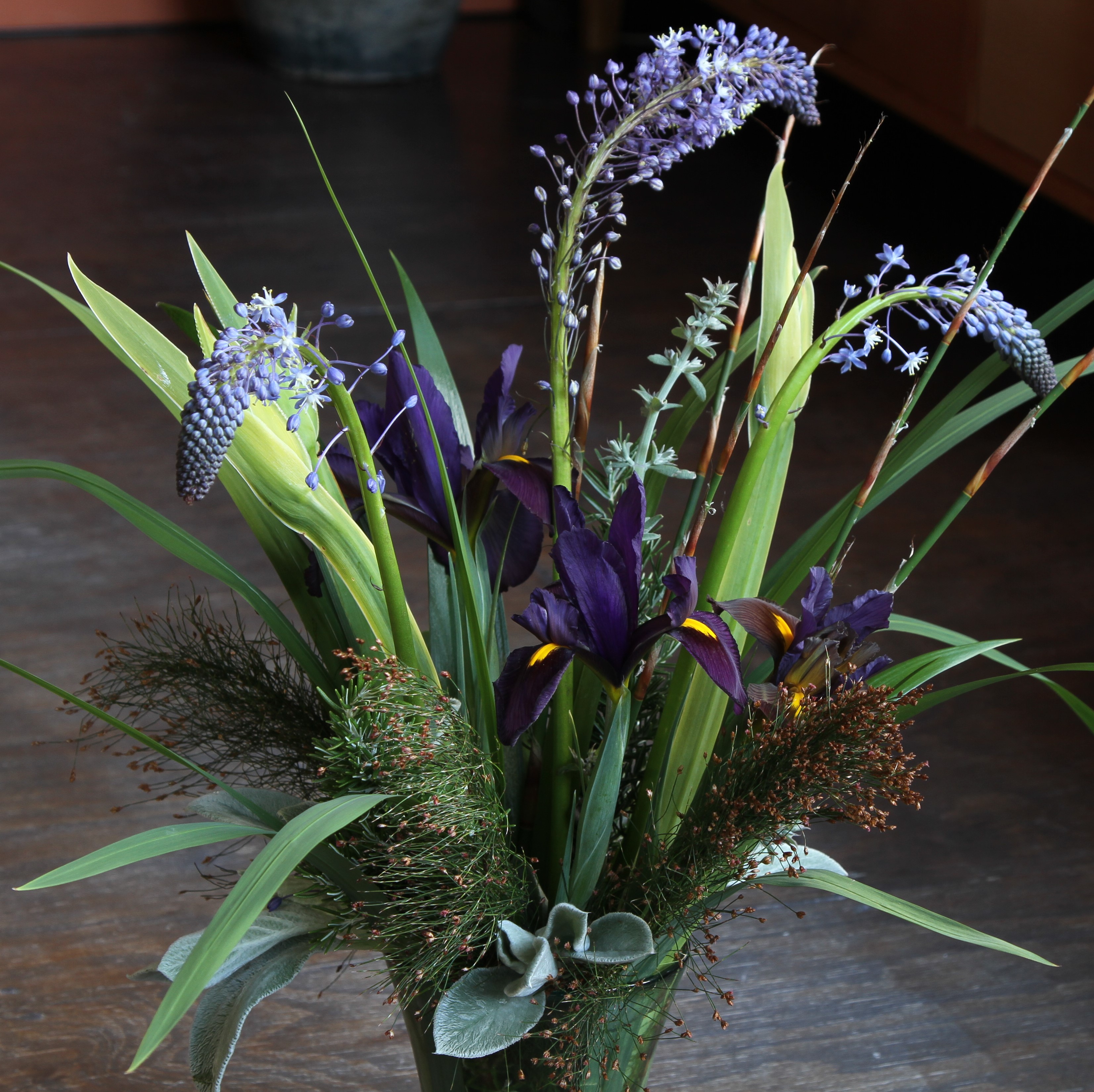 In the vase I have tried to avoid this, combining it with Restios, Rosemary, Iris Eye of the Tiger, Iris neomarica buds, White Sage and Lambs Ears.