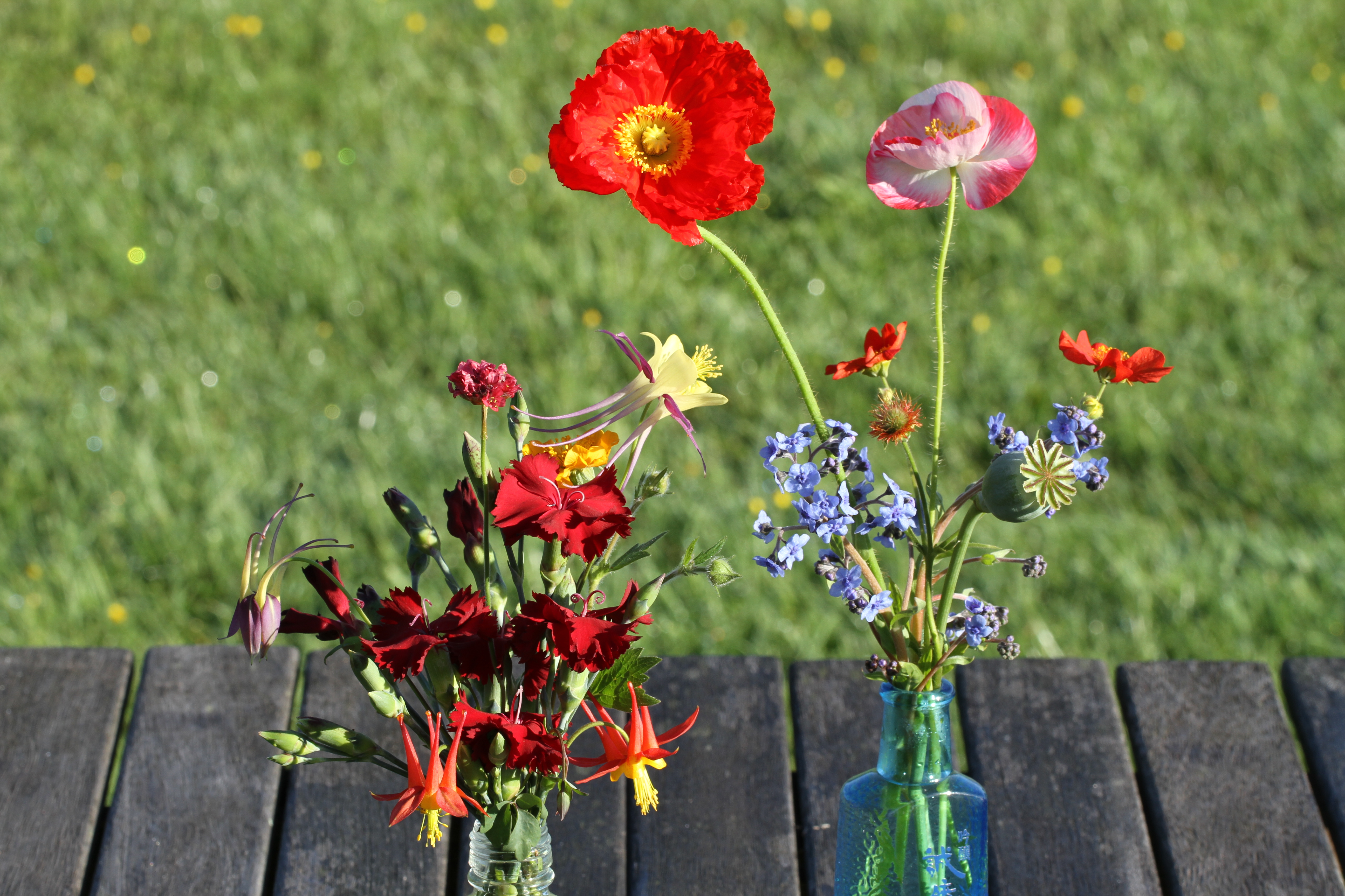 The blue bottle has poppies, an Iceland Poppy and one that came from a mixture and a seed head of another, along with a red Geum, Mrs. Bradshaw I think, and some Cynoglossom Amabile or Chinese Forget-me-not.