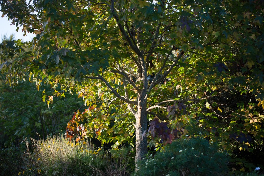 The blue mist and the sedums down the driveway were happily filled with bumble bees, but not many honeys. When I arrived at the Louisa plum trees the reason was clear, fruit was the breakfast choice. On the tree and on the ground, the overripe and bird-pecked plums were full of bees. Not a wasp in sight, only bees.